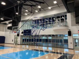 - An inviting entry lobby with a wood ceiling, pendant lighting, trophy cases, concession stand and full-height windows overlooking the basketball court.